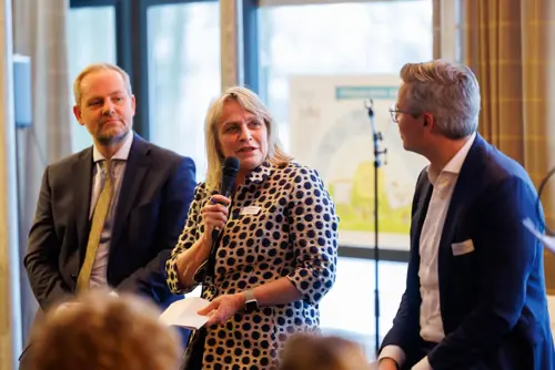 Marjolijn Sonnema, Aiko de Raaf (kwartiermaker IZA, Ministerie van VWS) en Pieter van der Zwan verzorgden de afsluiting van de dag. Thema’s als intrinsieke motivatie als basis, superverbinders om te versnellen en vertrouwen in de regio en de bijbehorende ruimte daarvoor kwamen daarbij aan bod.