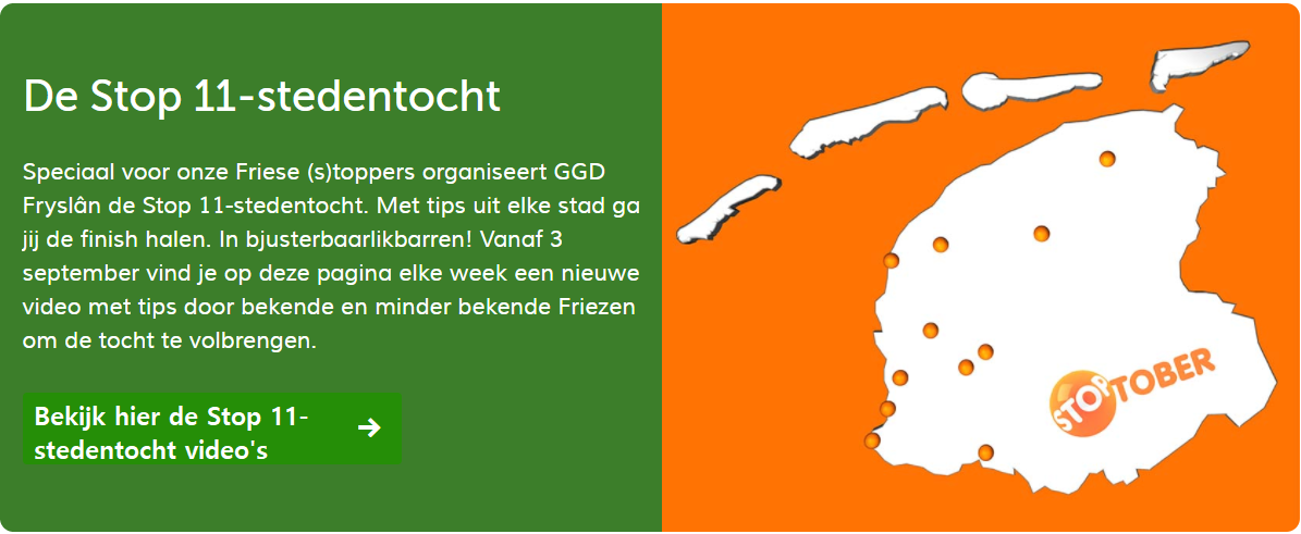 Voor de Friese (s)toppers organiseert GGD Fryslân in samenwerking met Rookvrije Generatie Fryslân de Stop 11-stedentocht. Meer informatie treft u hieronder in de afbeelding.