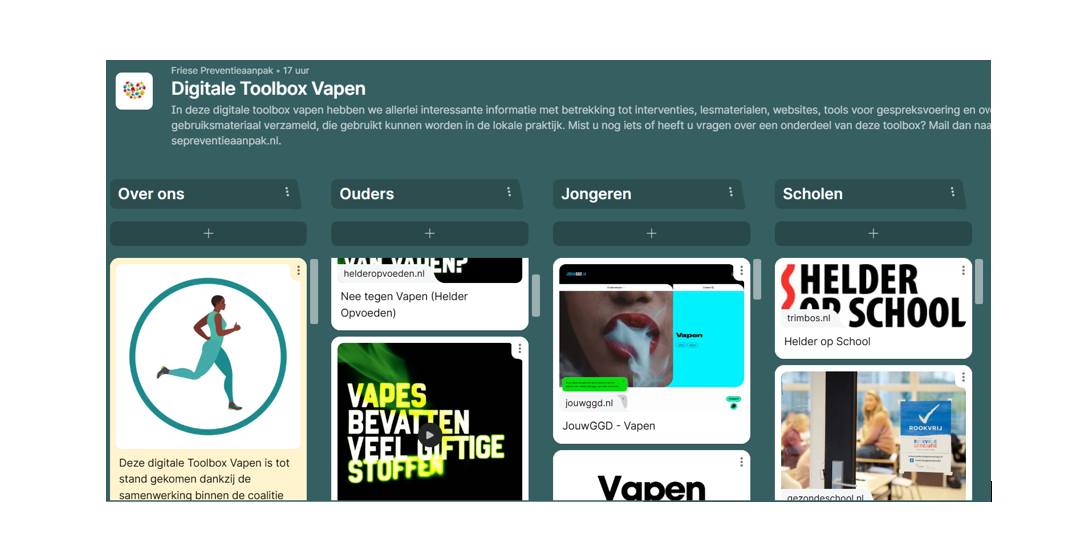 Vanuit de coalitie 'Gezond leven' is een digitale Toolbox Vapen ontwikkeld. Deze toolbox biedt u als beleidsmaker/professional een uitgebreide verzameling aan links naar o.a. websites, downloads en video's over het thema 'Vapen'. De informatie is overzichtelijk gestructureerd in verschillende kolommen, waaronder: 'Ouders', 'Jongeren', 'Scholen', 'Professionals', 'Stoppen met vapen', 'Beleid & Handhaving' & 'Voor iedereen'.
